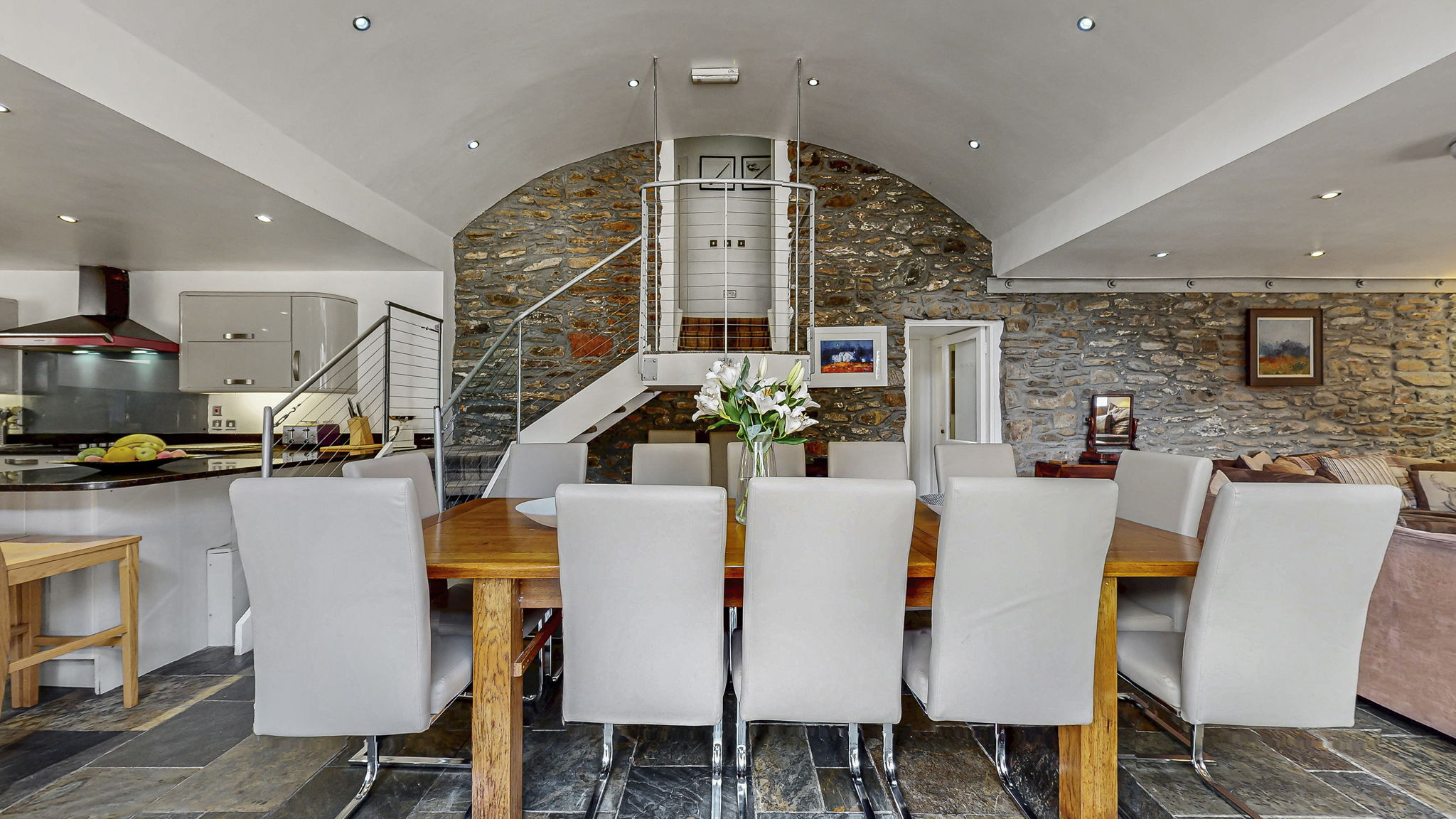 At its heart lies a spectacular 75m2 open-plan reception and living area—a soaring, double-height space that blends a contemporary kitchen, elegant dining area, and generous lounge. It’s a wonderful social space, that once hosted a wedding ceremony for 125 people – so it swallows people when it needs to!!