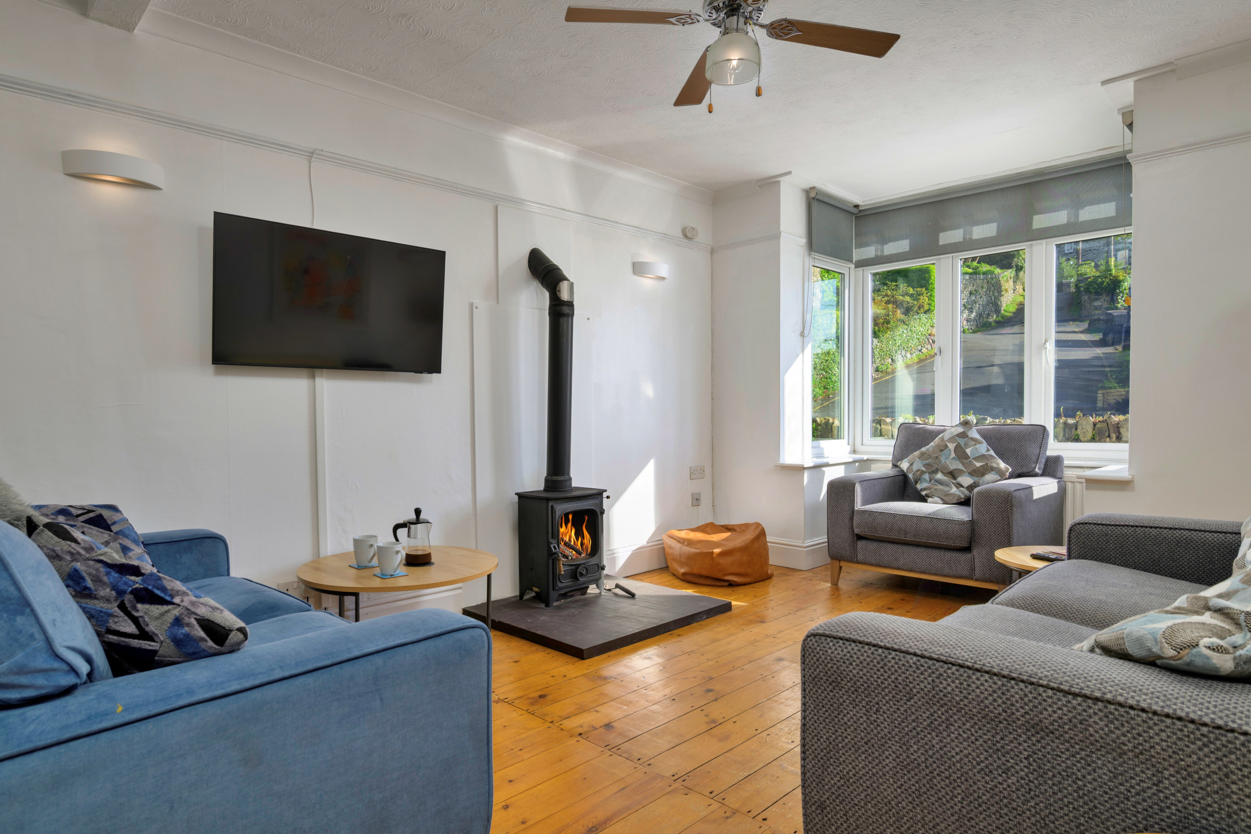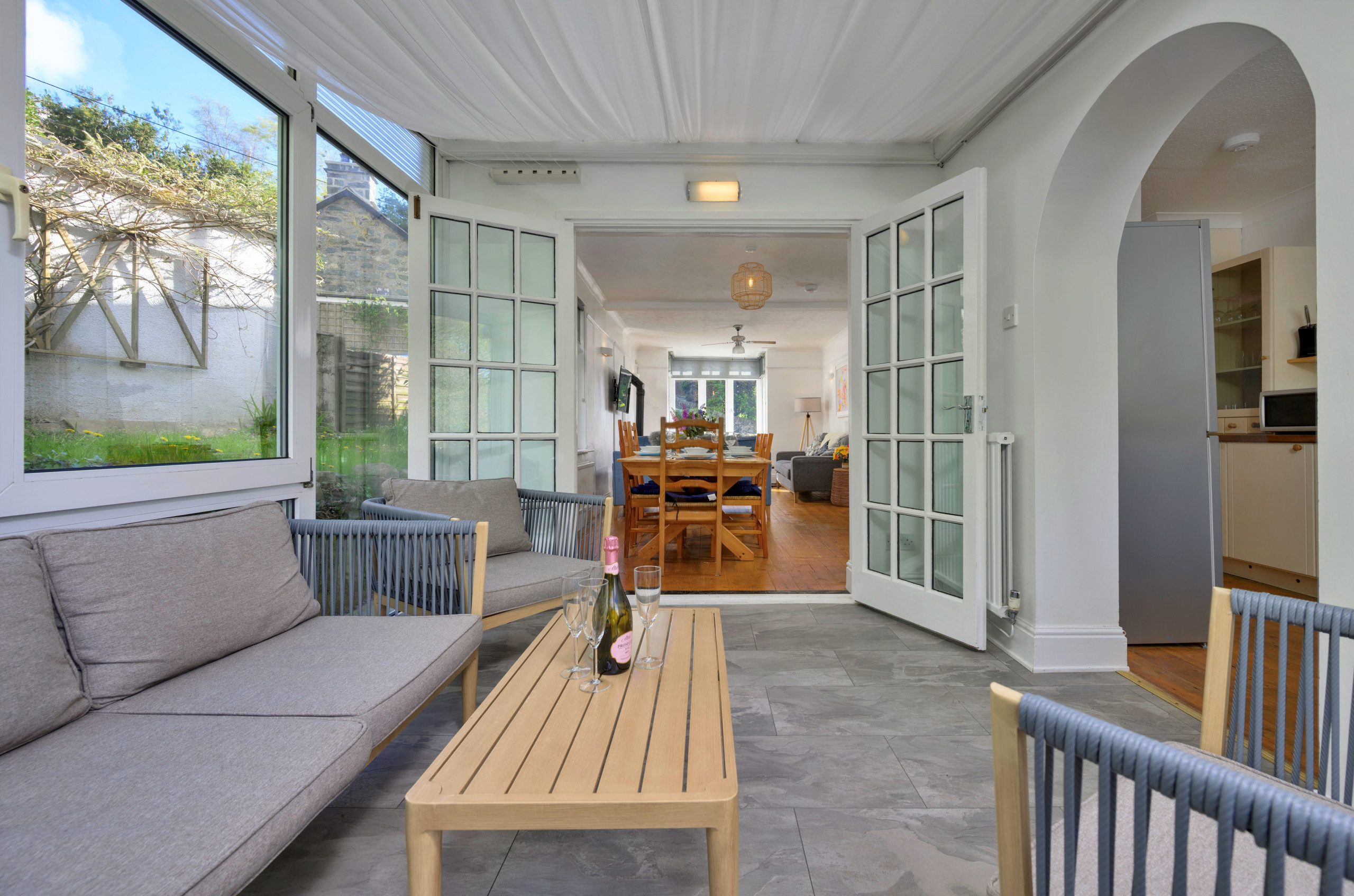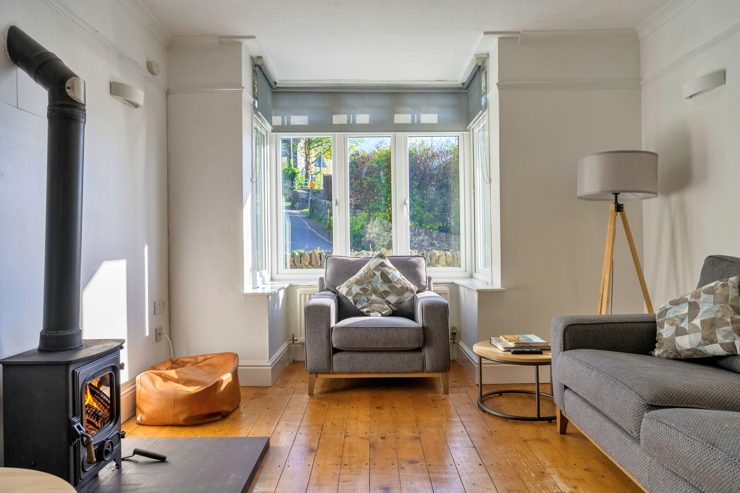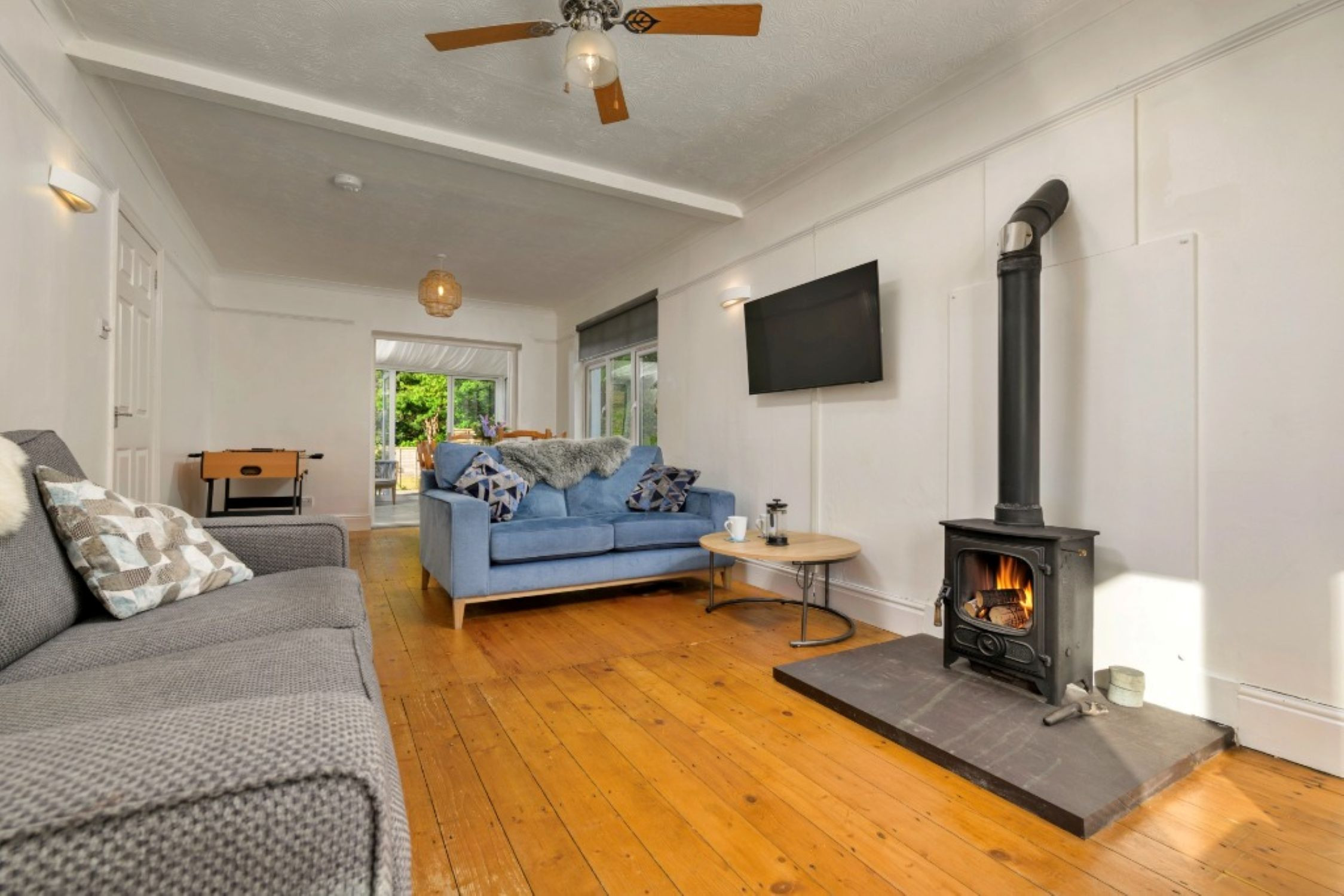 Inside, the property is thoughtfully furnished to provide a warm and inviting atmosphere. The open-plan lounge and dining area is ideal for unwinding, complete with a wood-burning stove and Smart TV for evenings in. A light-filled conservatory offers a peaceful spot to relax after a day of exploring, while the fully equipped kitchen makes meal preparation easy—whether dining indoors around the large table or enjoying al fresco meals in the garden as the sun sets over the bay.
