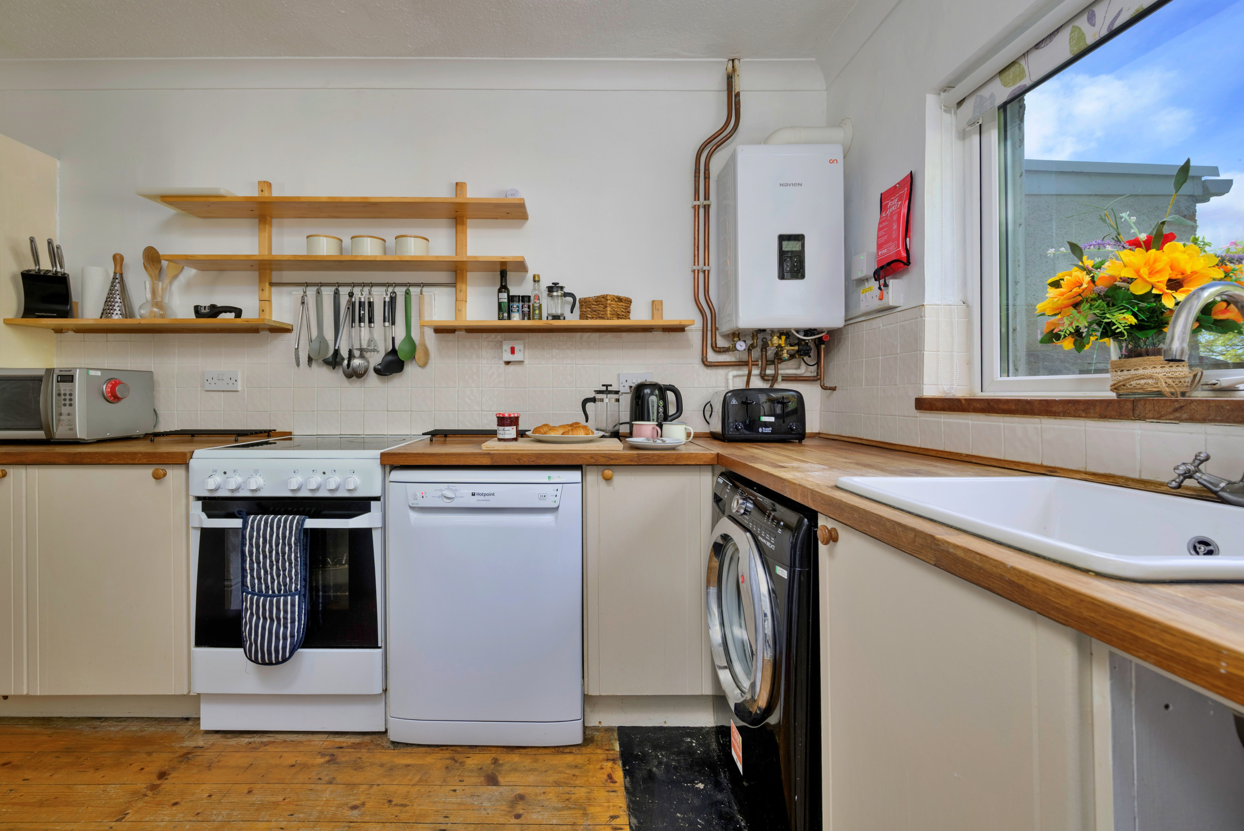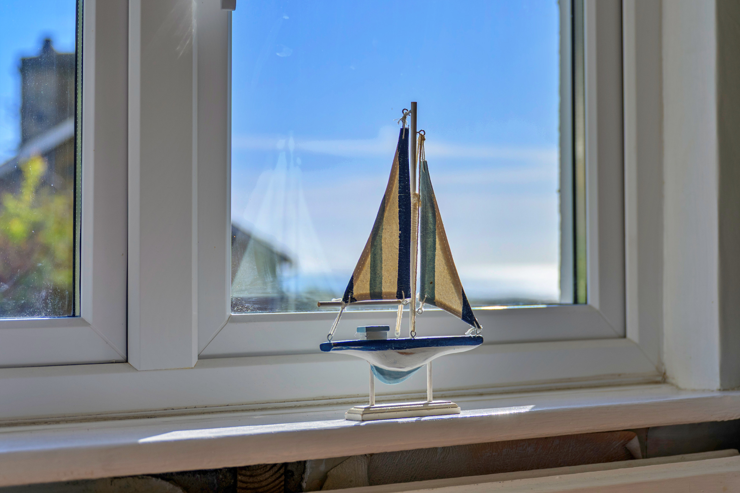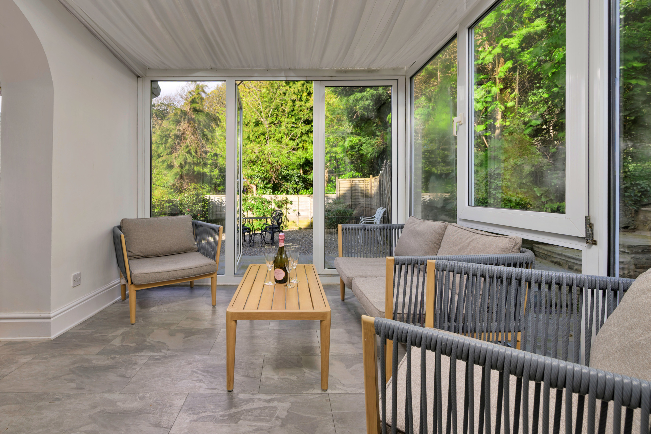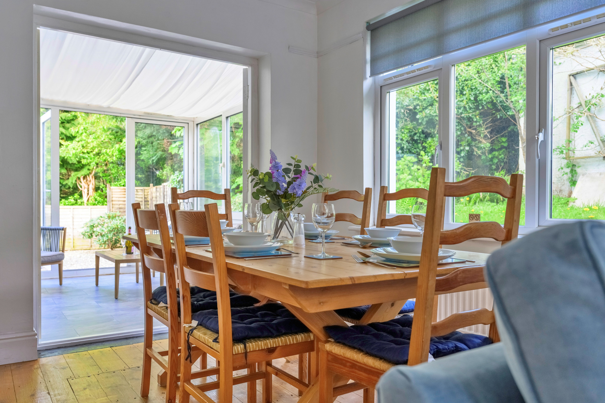 Inside, the property is thoughtfully furnished to provide a warm and inviting atmosphere. The open-plan lounge and dining area is ideal for unwinding, complete with a wood-burning stove and Smart TV for evenings in. A light-filled conservatory offers a peaceful spot to relax after a day of exploring, while the fully equipped kitchen makes meal preparation easy—whether dining indoors around the large table or enjoying al fresco meals in the garden as the sun sets over the bay.