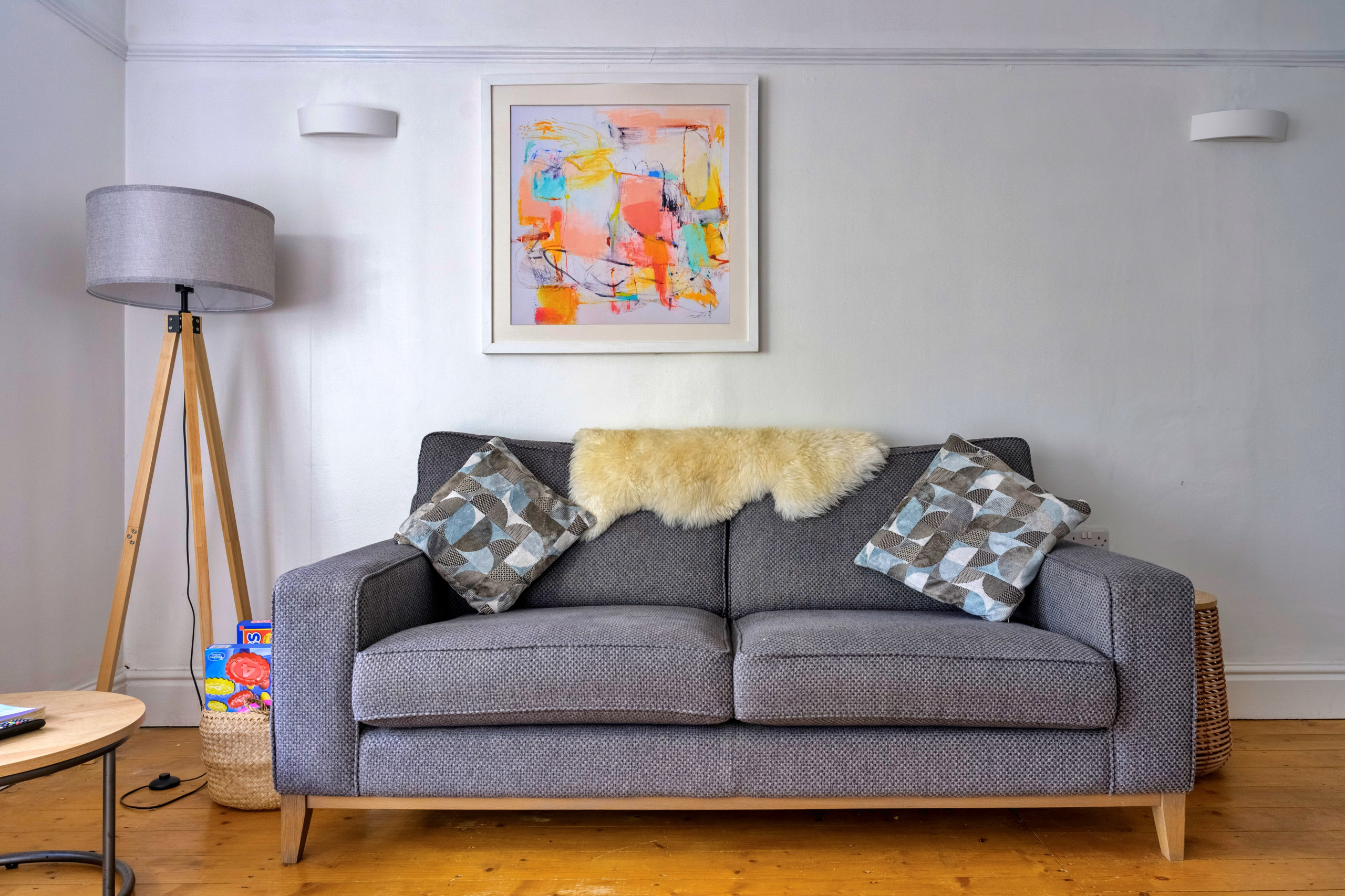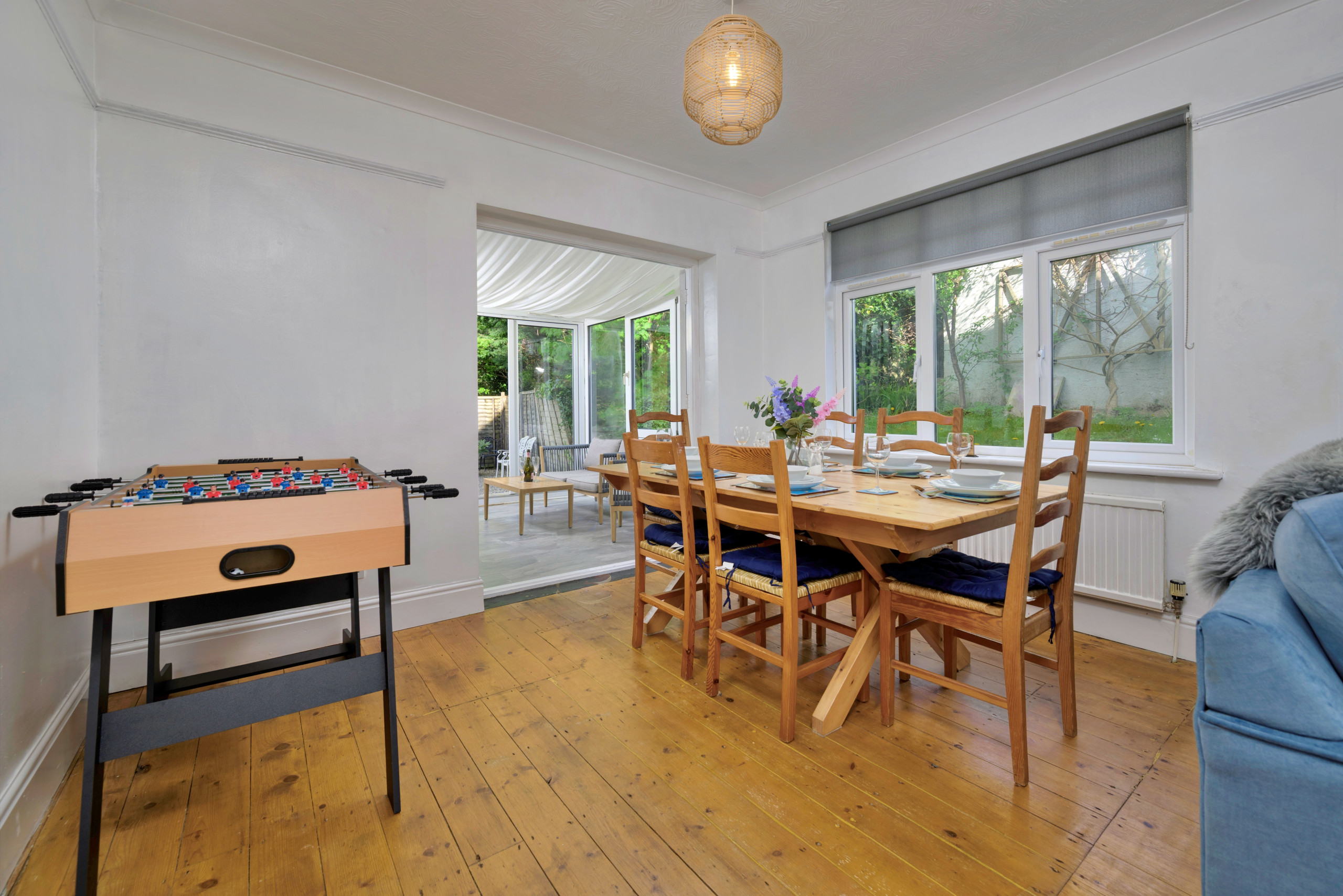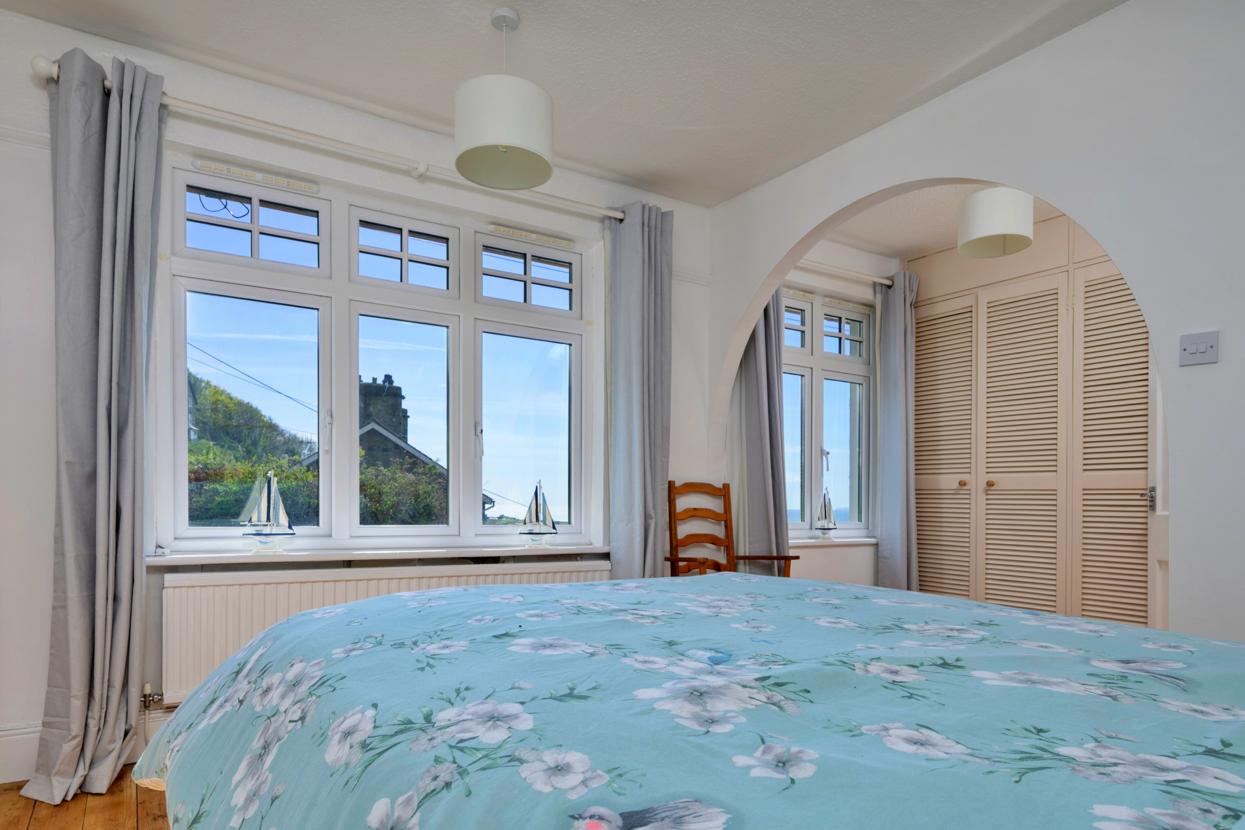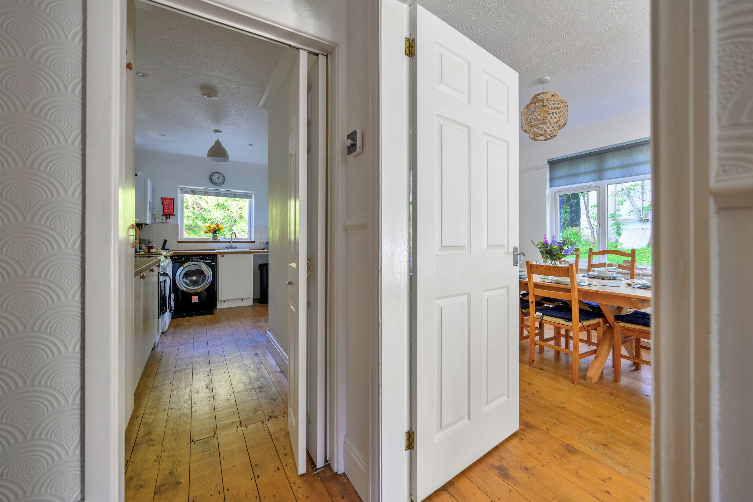 Inside, the property is thoughtfully furnished to provide a warm and inviting atmosphere. The open-plan lounge and dining area is ideal for unwinding, complete with a wood-burning stove and Smart TV for evenings in. A light-filled conservatory offers a peaceful spot to relax after a day of exploring, while the fully equipped kitchen makes meal preparation easy—whether dining indoors around the large table or enjoying al fresco meals in the garden as the sun sets over the bay.