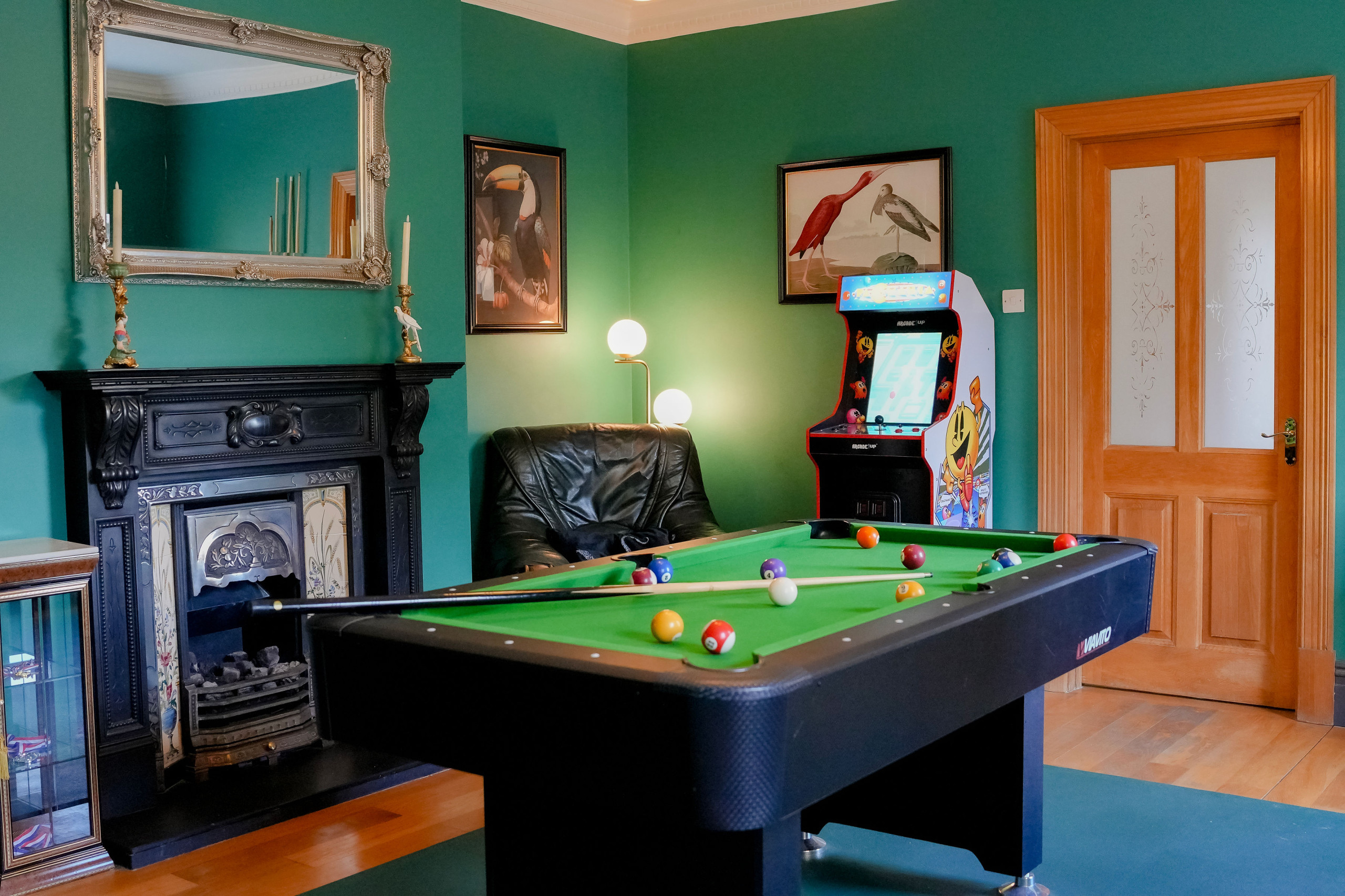 • Billiard Room: Includes a pool table and decorative fireplace.