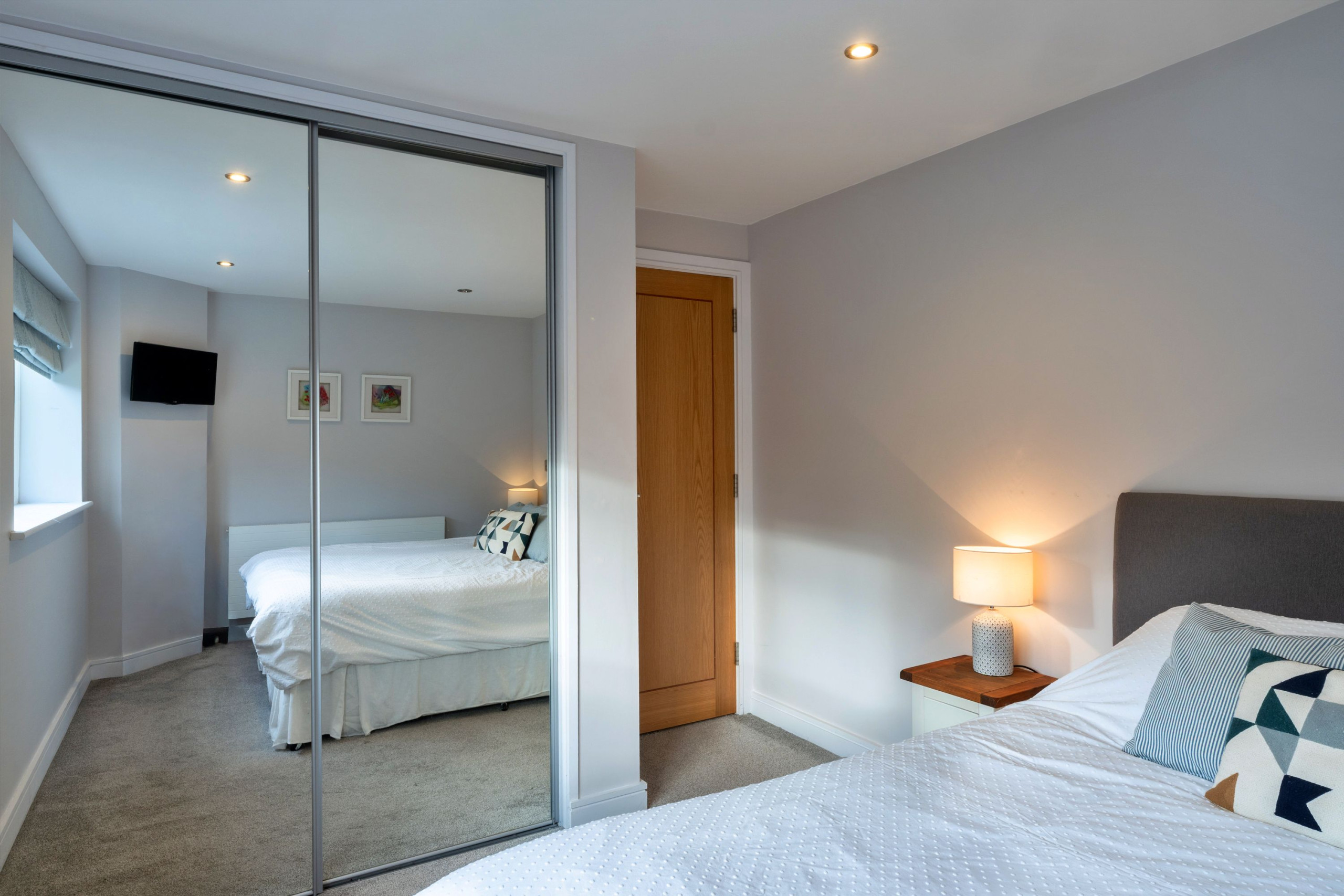 The sleeping layout works especially well for families travelling together. On the second floor there are three bedrooms: a king-size master with TV, en-suite shower room and Juliet balcony, a super-king that can be set up as twins on request, and a third twin room that can convert to a king-size if needed. A spacious family bathroom on this floor includes both a bath and a large walk-in shower. The fourth bedroom is a ground-floor double, making it ideal for grandparents or anyone who’d prefer fewer stairs.