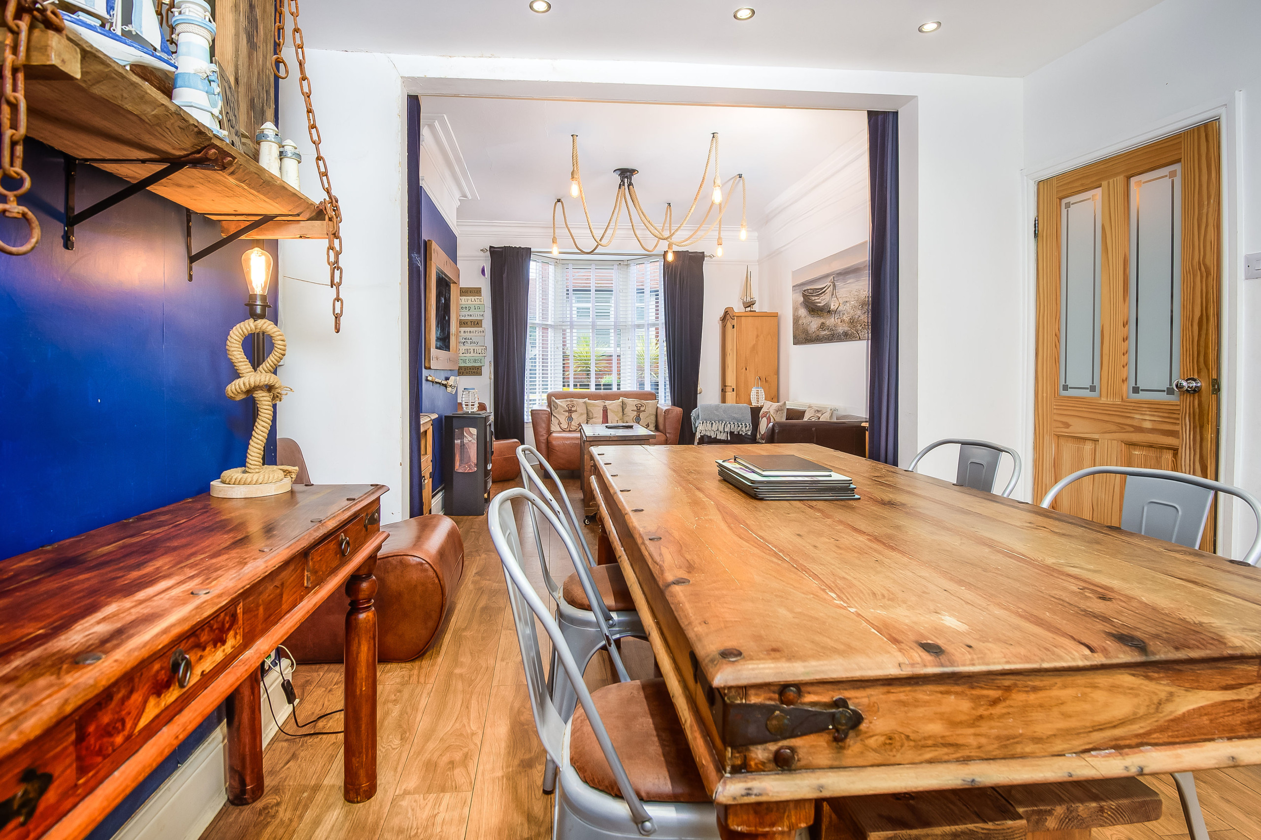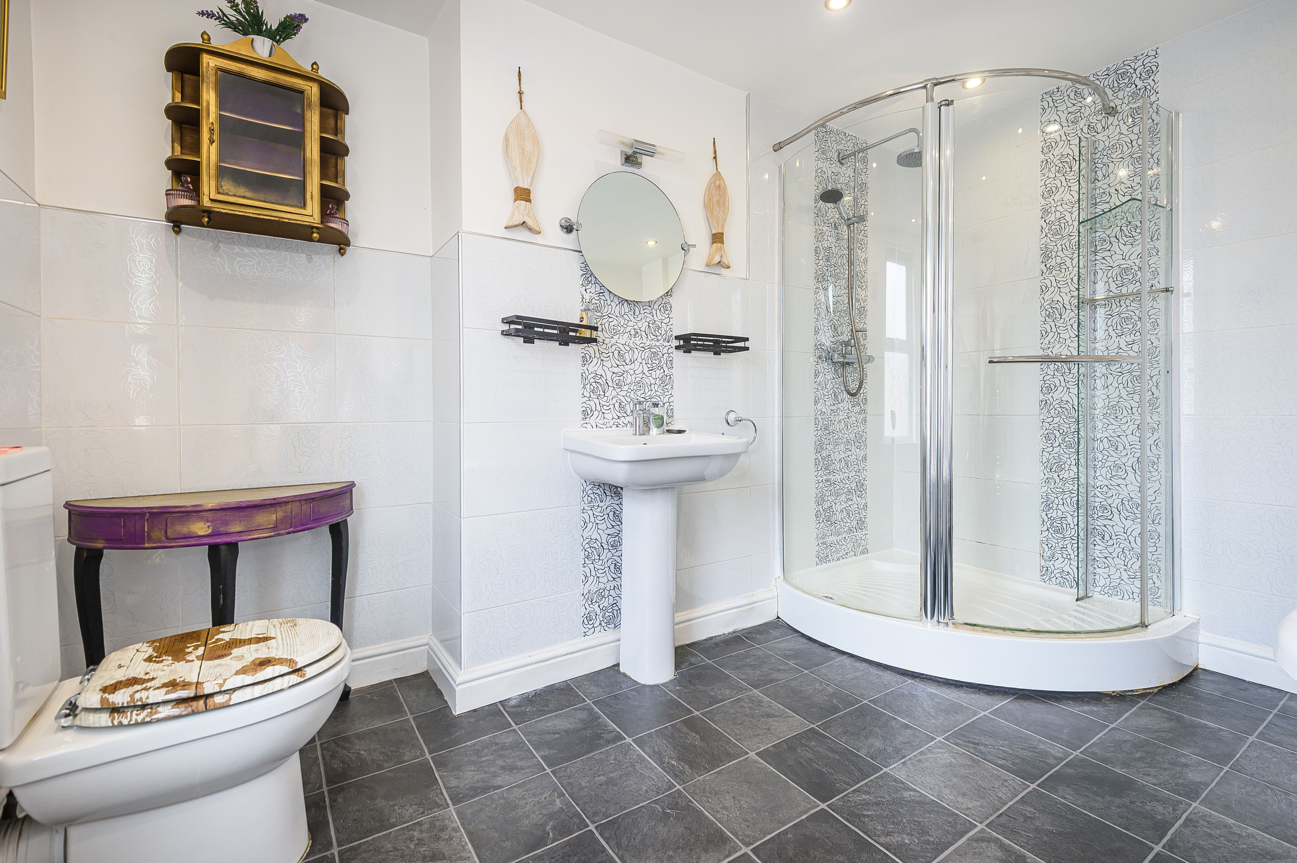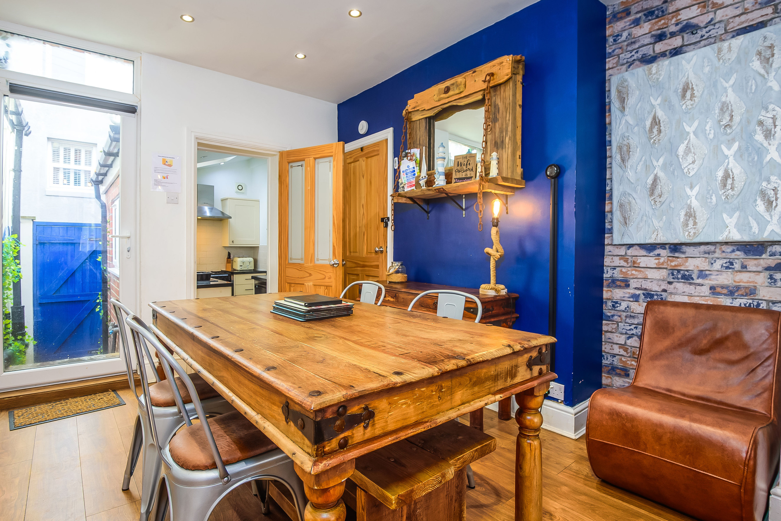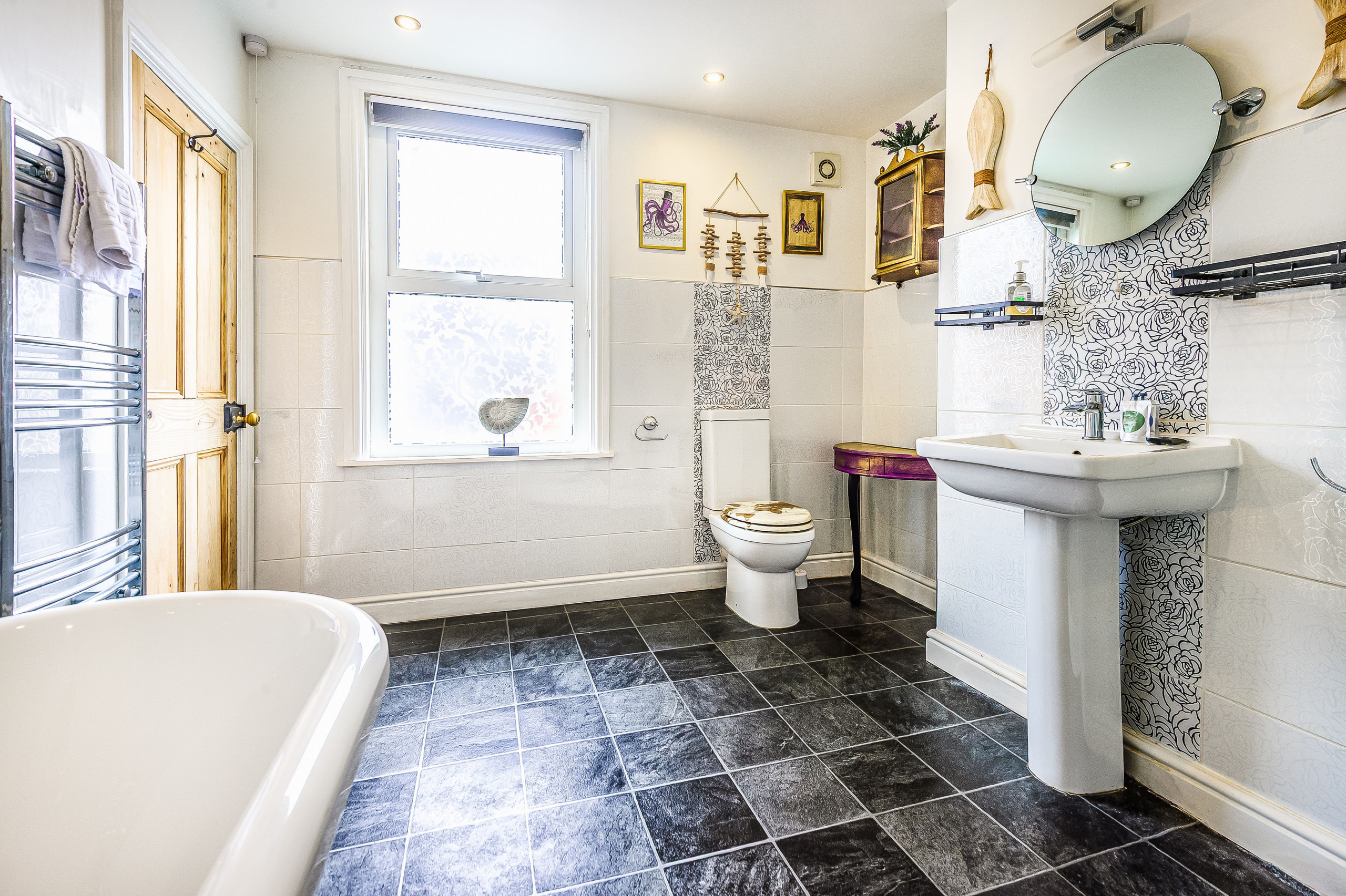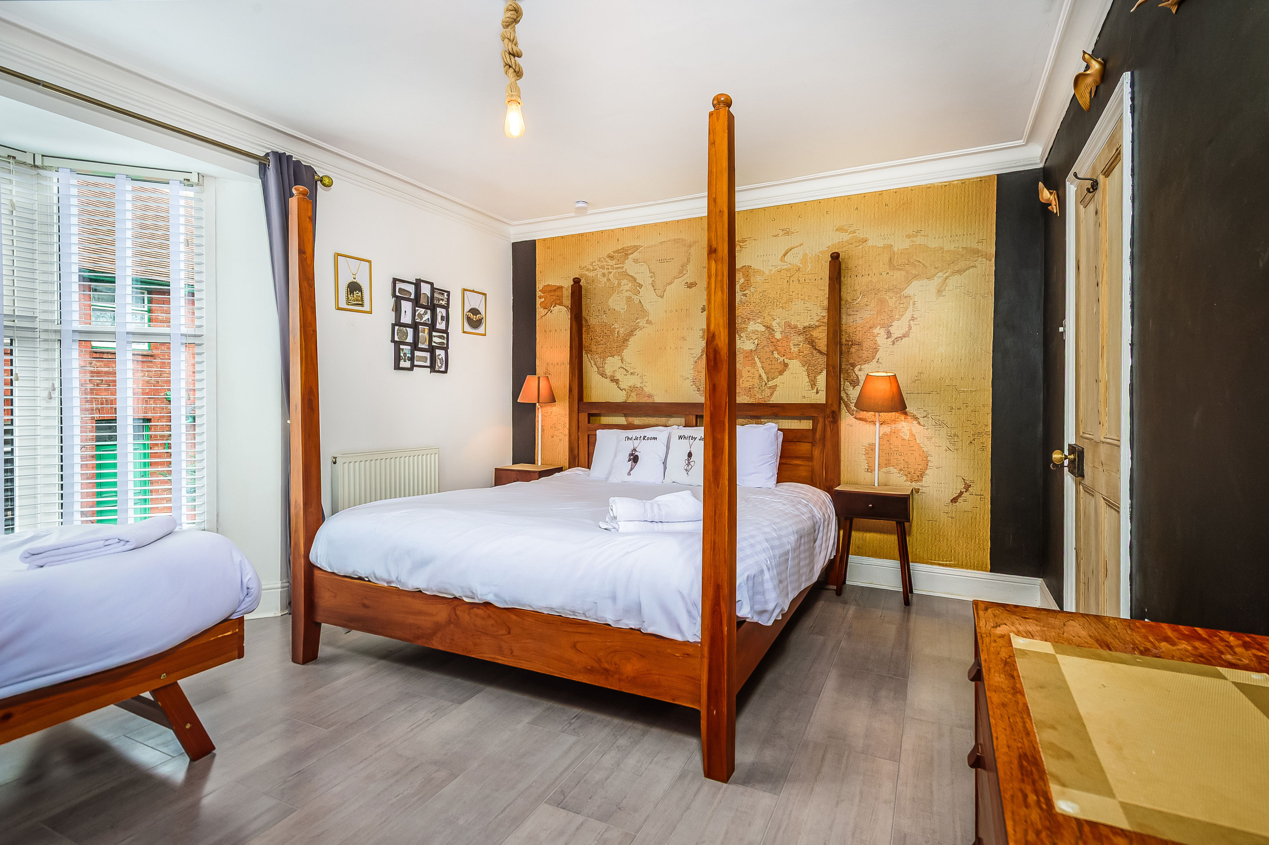 Upstairs, the main bathroom features a freestanding bathtub and a walk-in shower. The first bedroom includes a four-poster king-size bed and a single bed, plus views over Whitby’s rooftops. On the top floor are two more bedrooms — one with a double bed and sofa bed, and another with a double bed. Both are bright and comfortable spaces to unwind after a day out. To the front of the property, a small enclosed south-facing seating area offers the perfect spot for a morning coffee or afternoon drink.