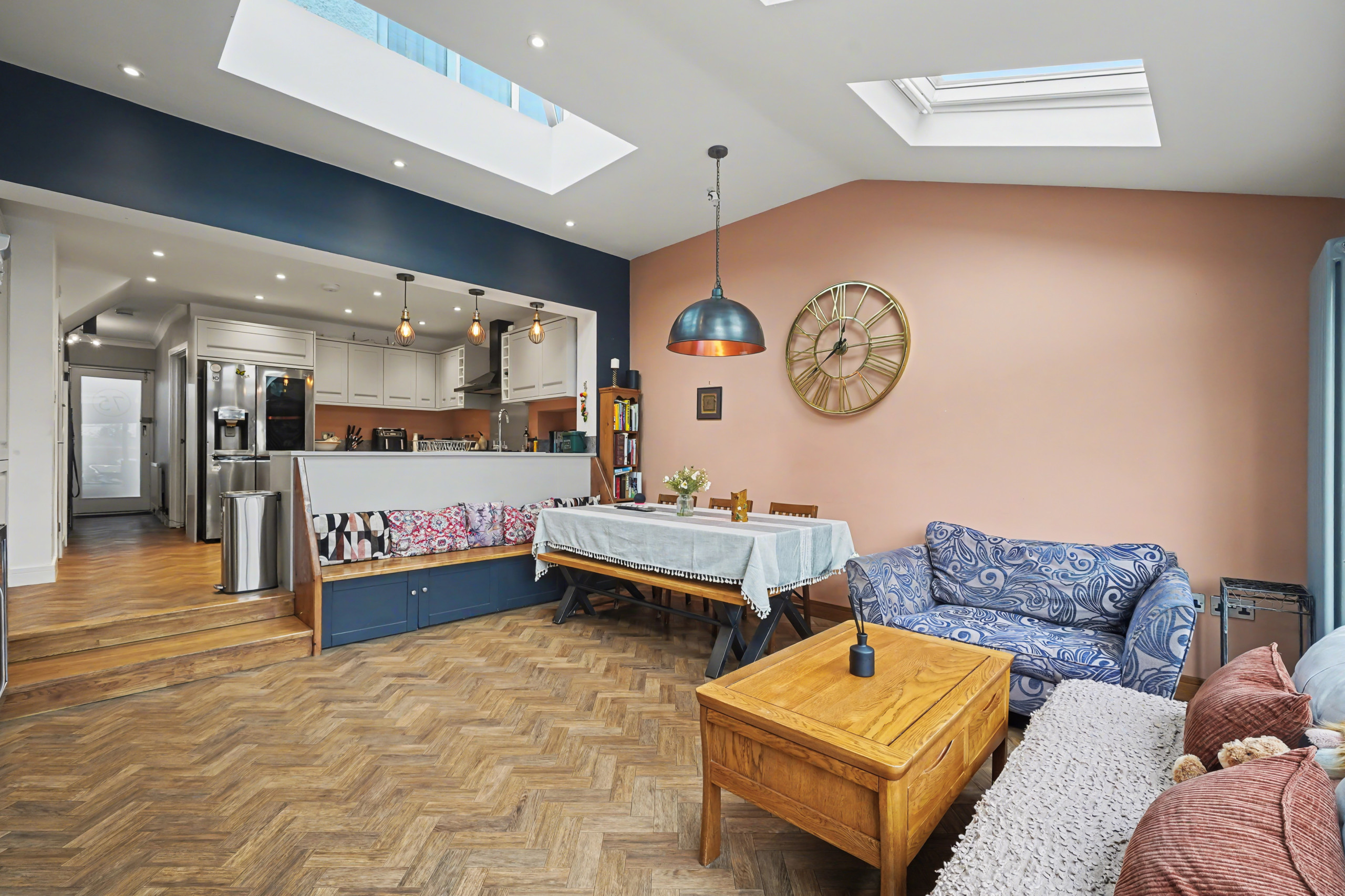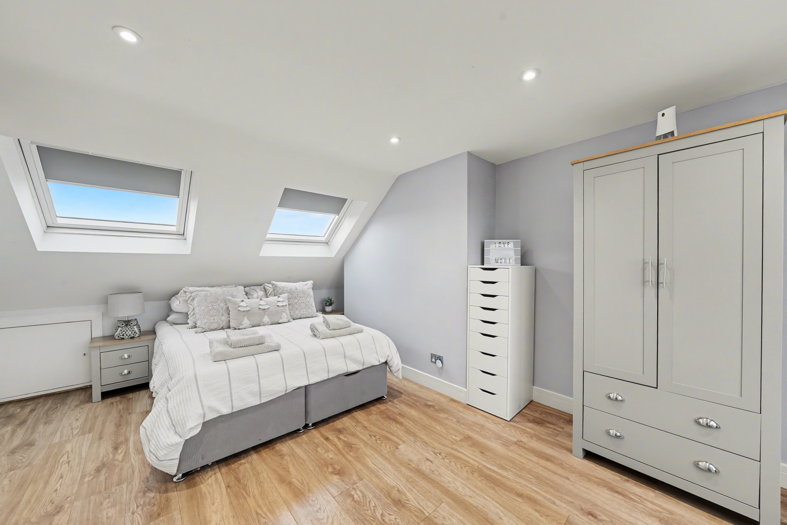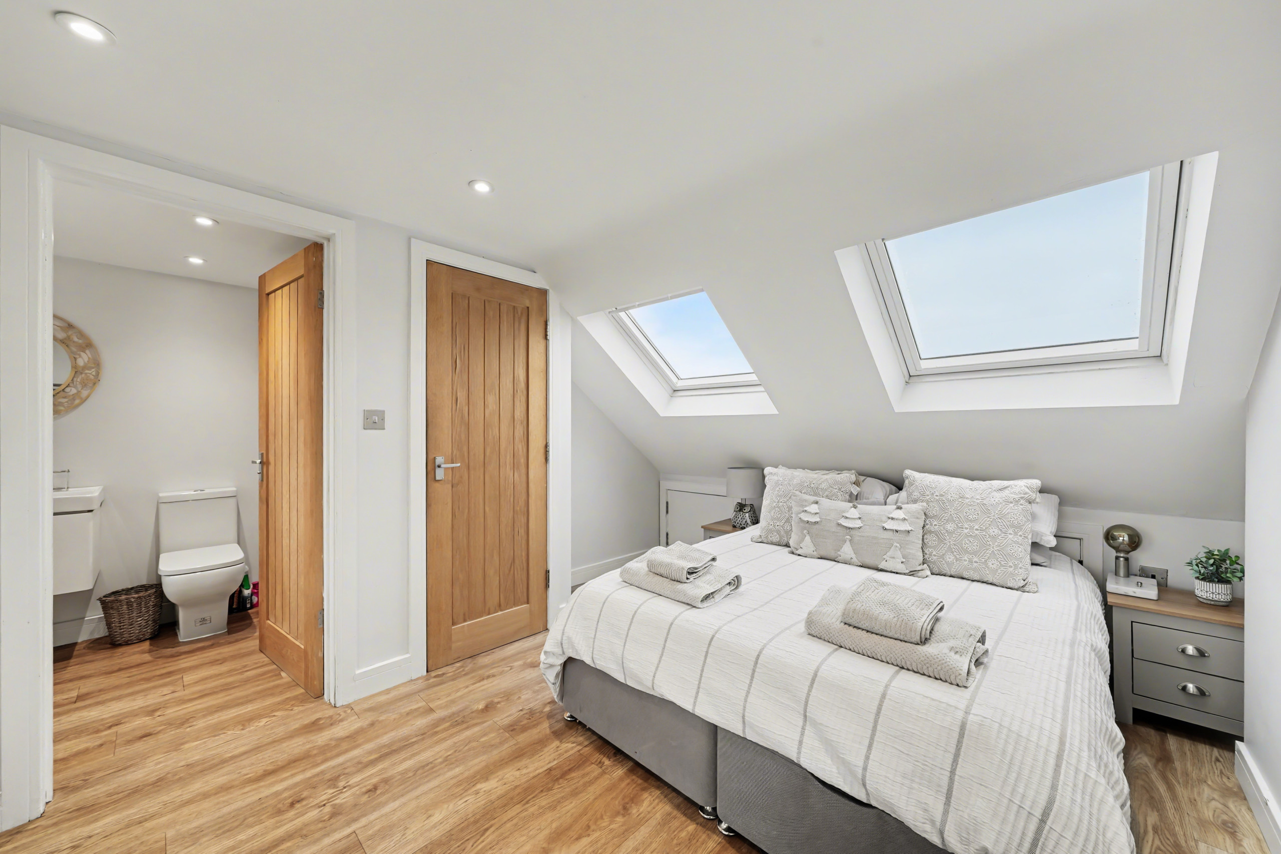 The heart of the home is a bright open-plan kitchen and dining area with large bi-fold doors that open onto a private patio and garden. Inside, you’ll find a 65” flat-screen TV with Sky, Sonos sound system, a double sofa bed, dedicated workspace and a fully equipped kitchen including an American-style fridge freezer and a Ninja air fryer. A downstairs WC adds extra convenience.